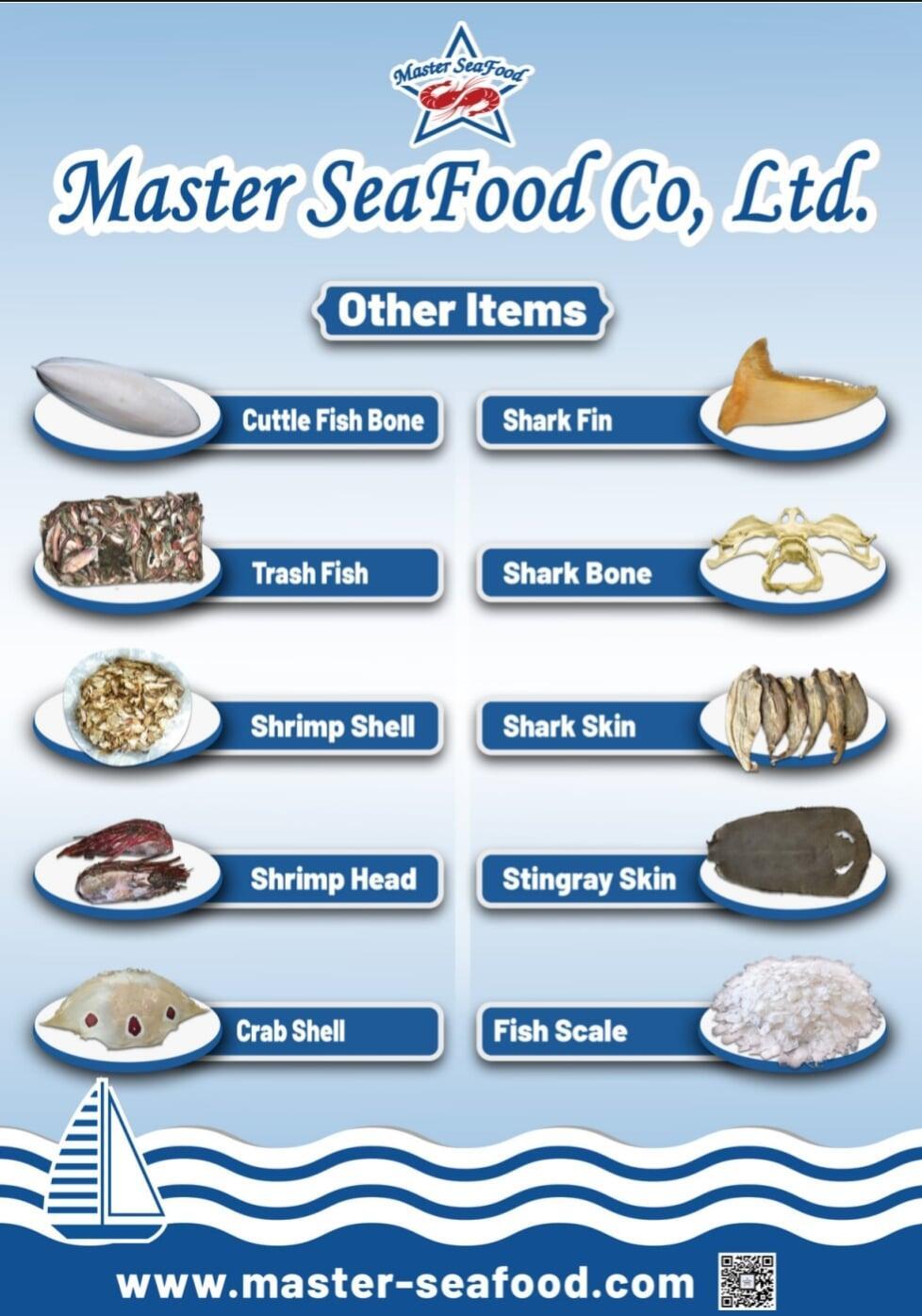 Master Seafood offers a specialized selection of premium marine products, including Shark Fin, Cuttle Fish Bone, and Stingray Skin. Meticulously sourced and processed to meet international standards, these high-demand items provide unique culinary and industrial value, ensuring a complete and professional seafood portfolio.
